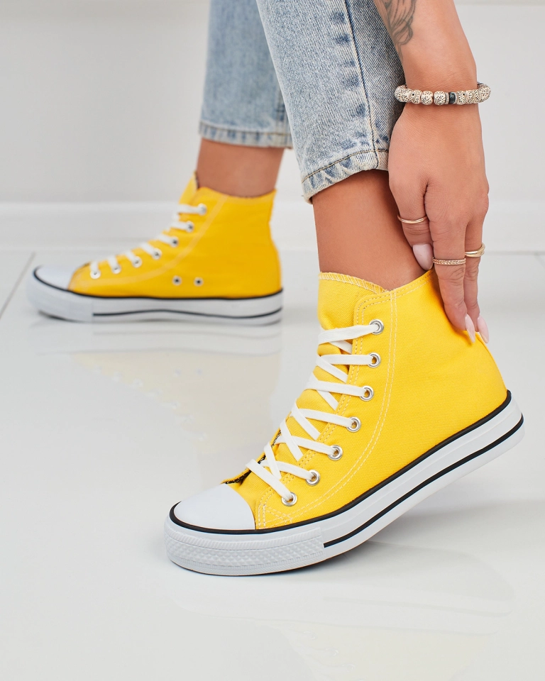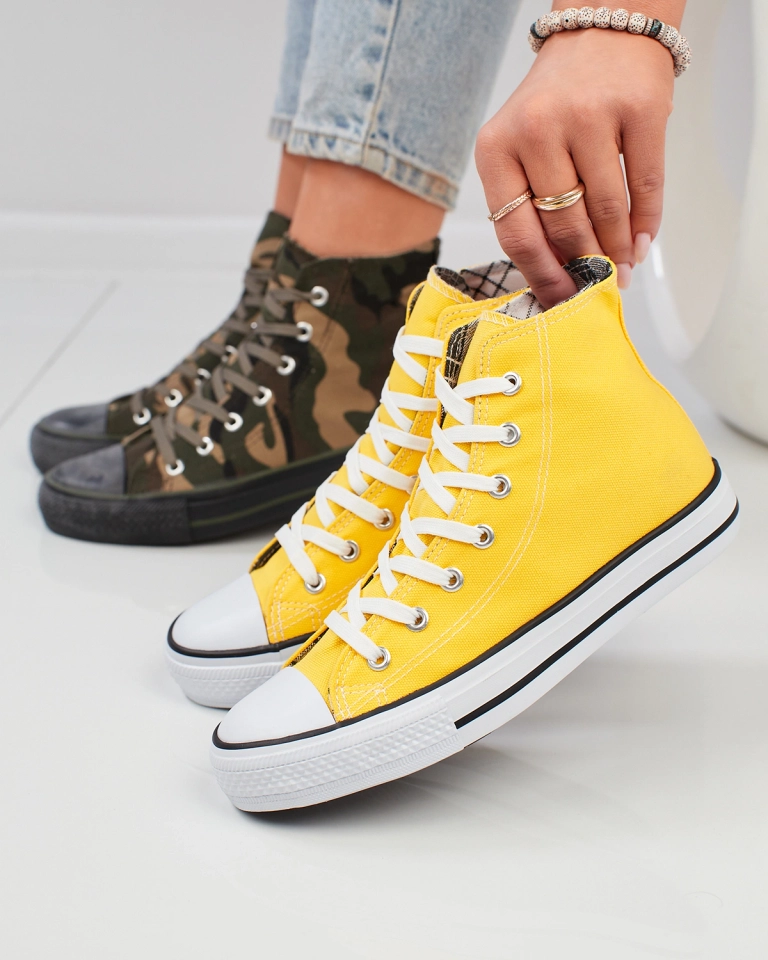 - Стильні жіночі високі кеди модного жовтого кольору. Верх виконаний з тканинного матеріалу, всередині тканинна устілка. Модель має шнурівку, завдяки чому ви зможете ідеально відрегулювати взуття по нозі.