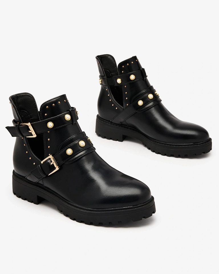 Royalfashion Чорні жіночі декоровані черевики на плоскому каблуці Pearl Elegance