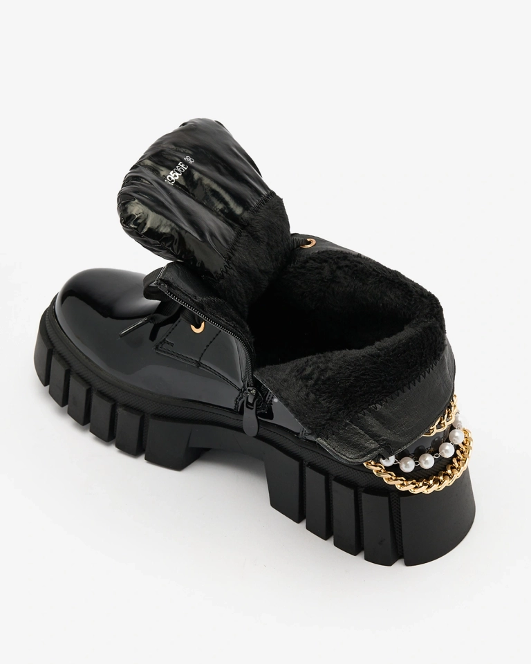 • Красиві жіночі черевики на шнурівці з екологічної лакованої шкіри, всередині наповнені м'яким хутром. Додатково в комплекті знімні ланцюжки з перлинами. Ідеально підходять для створення стильних образів! ЧОРНІ ЖІНОЧІ УТЕПЛЕНІ ЧЕРЕВИКИ DAHAFF