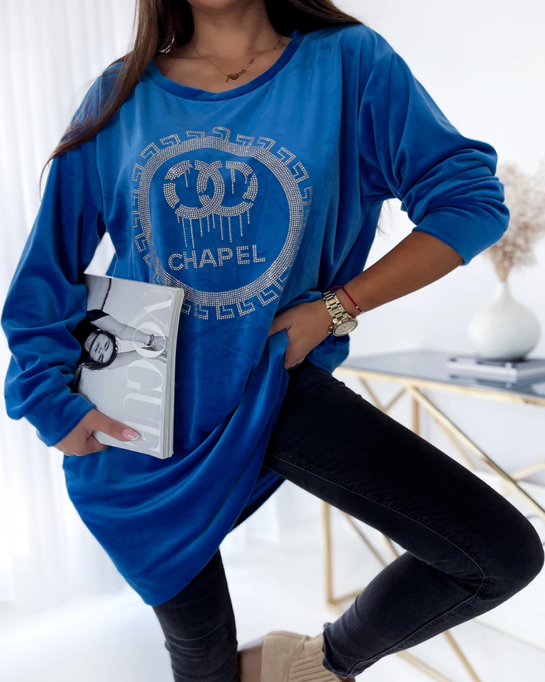 • Стильна жіноча довга туніка, виконана з м'якої тканини а-ля велюр. Виріб декорований нашивкою з цирконію, має довгий рукав та дві врізні кишені. Must have в гардеробі кожної жінки! ПРИМІТКА: Похибка вимірювання (+/-) 1 см.