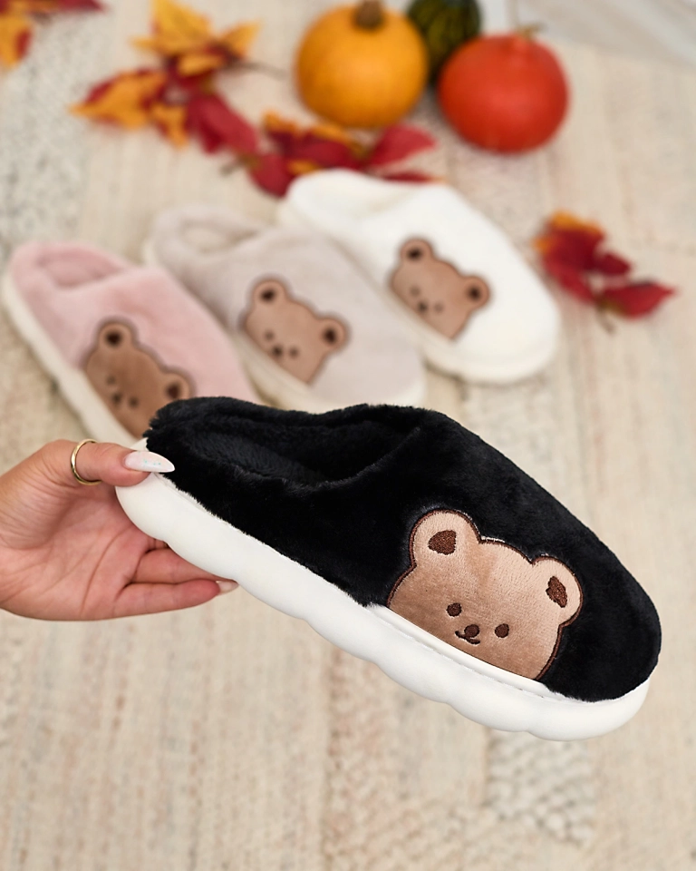 - Śliczne damskie kapcie na płaskiej podeszwie, zdobione naszywką z misiem. Model wykonany z materiału imitującego futerko. Świetna propozycją dla domowych outfitów!
