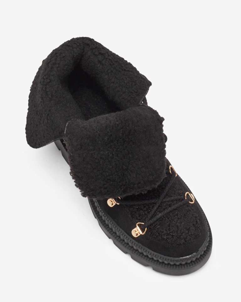 - Стильні жіночі черевики-трапери на шнурівці ідеально підходять для холодних днів. Верх виконаний з комбінації еко-замші та м'якої овчини. Внутрішня частина також утеплена овчиною, що робить їх не тільки модними, але й теплими
