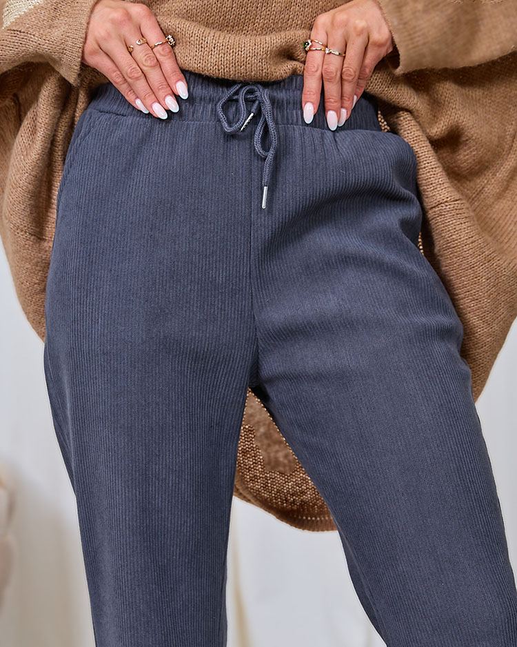 - Сенсаційні широкі жіночі штани з вельветової тканини. Модель має еластичний пояс з регульованими зав'язками. Крім того, спереду дві врізні кишені. Хіт цього сезону!