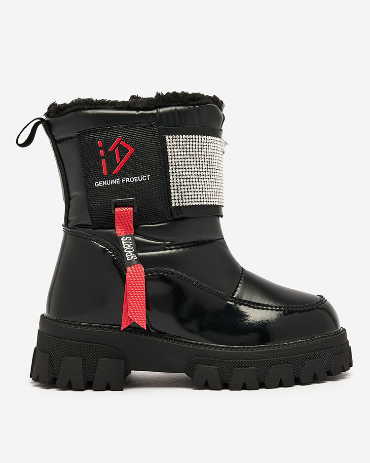 - Красиві дитячі снігоступи. Верх виконаний з лакованої шкіри та штучного матеріалу a'la cerata. Усередині утеплені густим хутром. Застібаються на блискавку та мають декоративний цирконієвий ремінь.