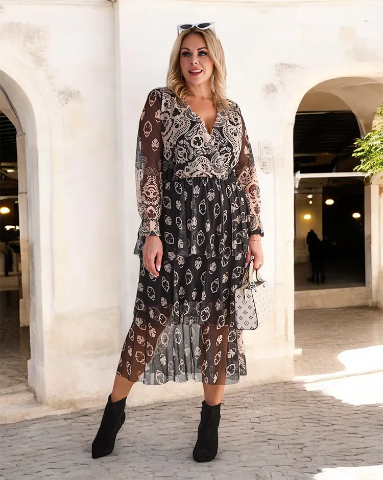 - Жіноча сукня міді з принтом з напівпрозорого матеріалу а-ля сітка на підкладці. Модель з довгими рукавами та вирізом у вигляді серця, з еластичним поясом. Ідеальна для повсякденного носіння!