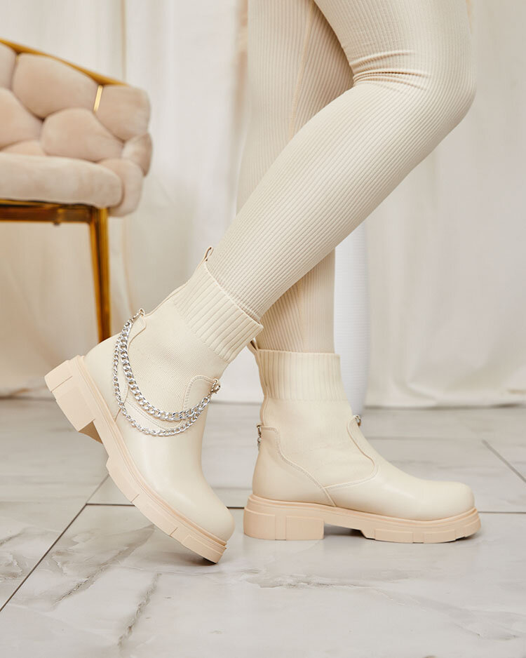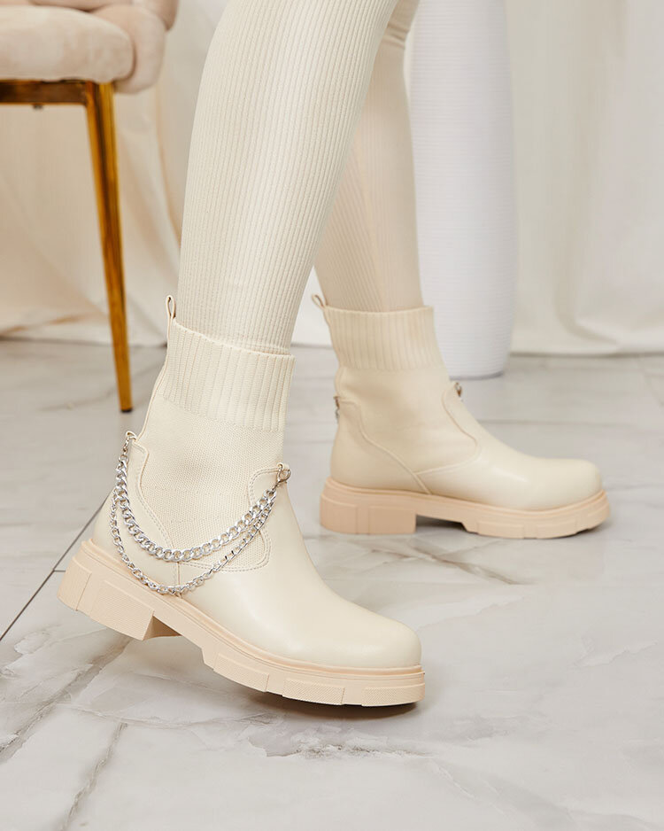 - Жіночі черевики на плоскому каблуці, декоровані знімним ланцюжком. Верх виконаний з текстильного матеріалу а'ля носок, має вставку з еко шкіри. Устілка з еко шкіри. БЕЖЕВІ ЖІНОЧІ ЧОБОТИ FOLDAF