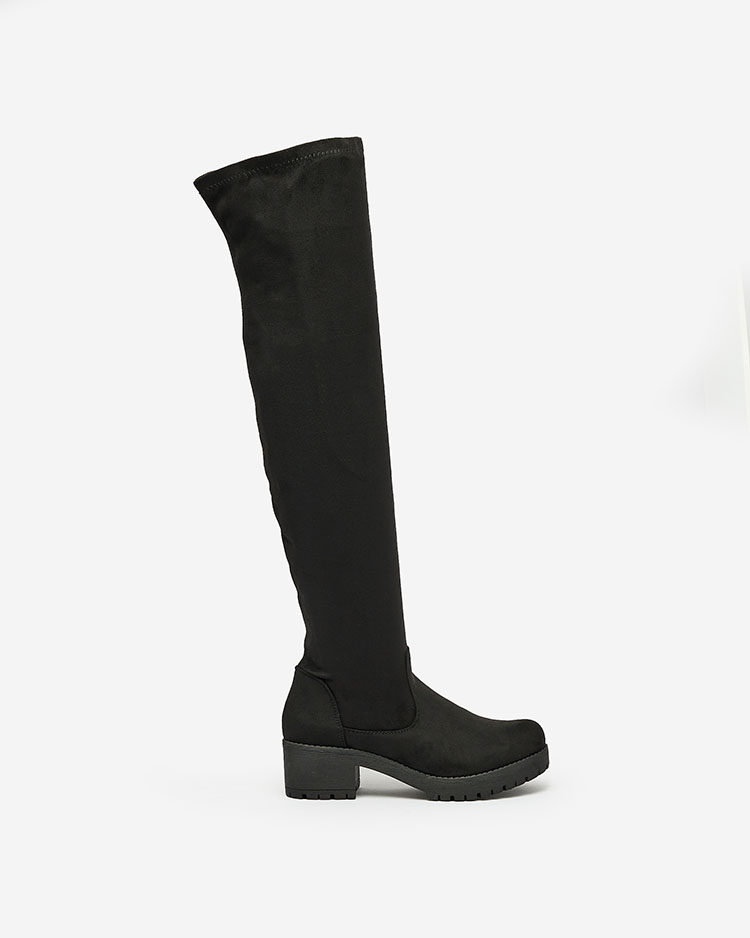 - Довгі жіночі чоботи на плоскому каблуці, верх з екозамші, устілка - м'яке хутро. Збоку застібка до середини ікри. Чудове доповнення до повсякденних образів