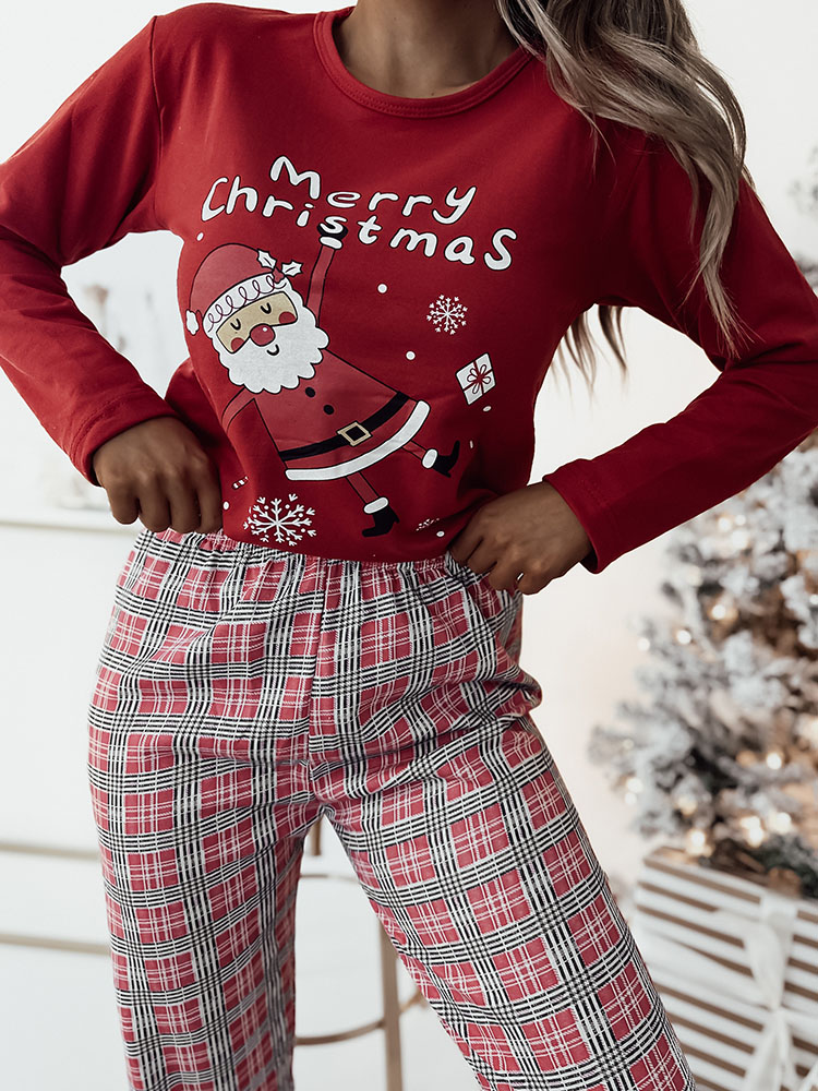 - Різдвяна жіноча піжама з бавовняної тканини з декоративним принтом. Комплект складається з блузи з довгими рукавами та штанів на еластичному поясі з прямими штанинами.