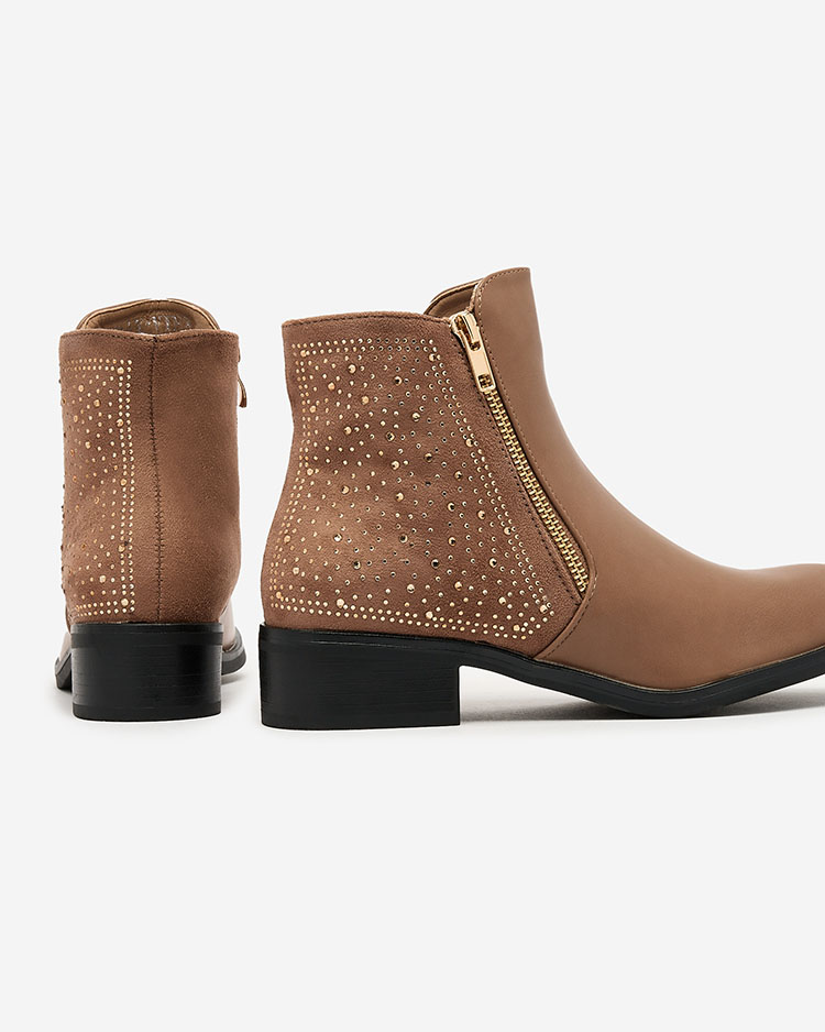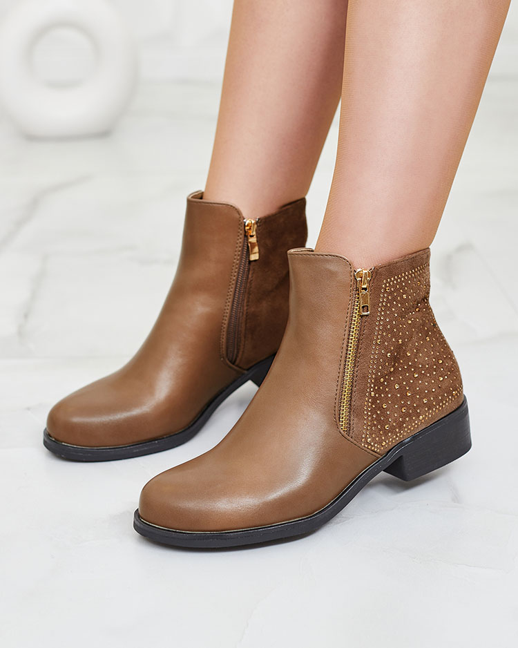 • Класичні жіночі чоботи а-ля соболь, верх з екологічної шкіри. Усередині утеплені м'яким хутром. Застібаються на блискавку, ззаду декоровані парчею. Стильно та комфортно!