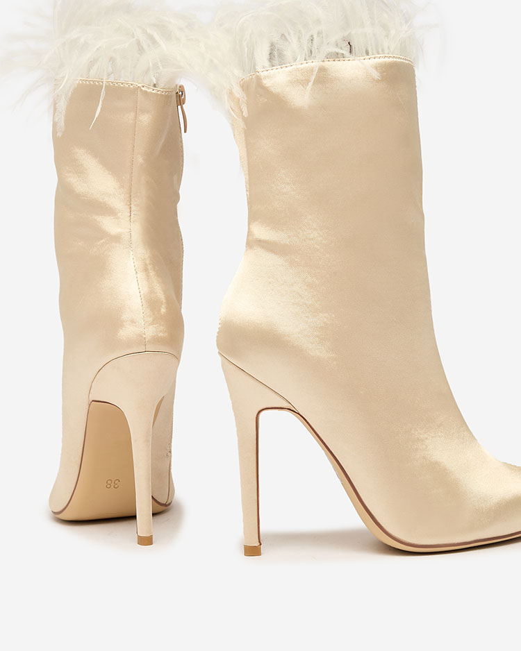 - Елегантні чоботи на шпильці з тканини а-ля атлас. Ніс закінчується загостреним кінчиком. Збоку блискавка і прикраса у вигляді пір'я на кінці верху. Чудове взуття для осінніх творінь!