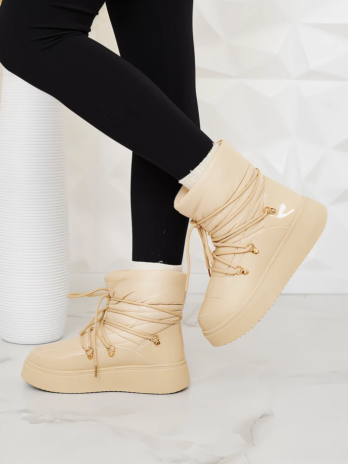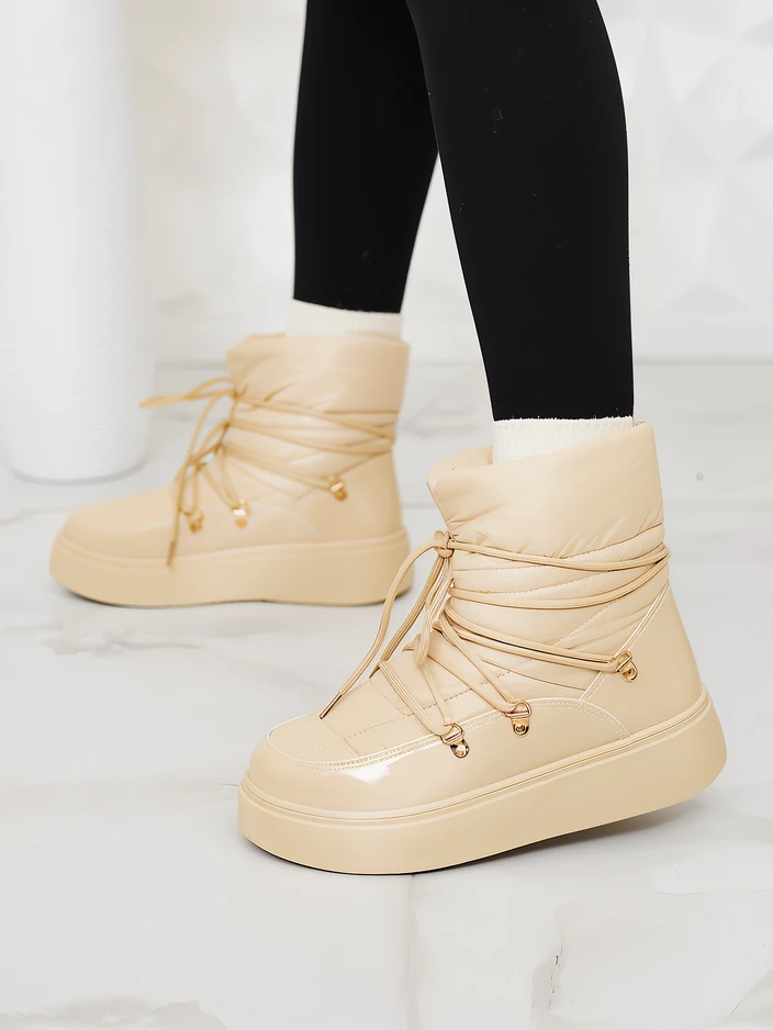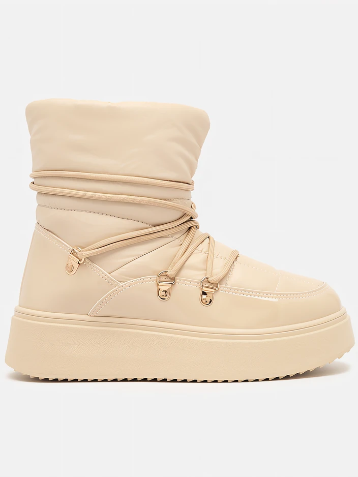 - Жіночі снігоступи поза часом. Верх виконаний з матеріалу a'la cerata та вставками з лакованої екошкіри. Усередині утеплення у вигляді хутра, взуття на шнурівці. Ідеальний варіант для холодної пори року!