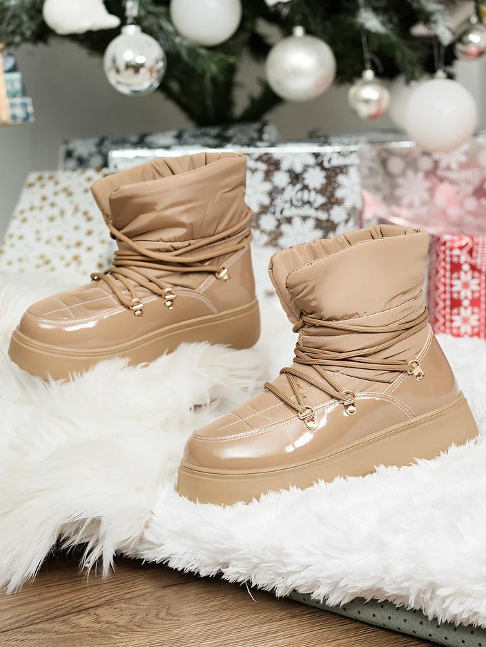 - Жіночі снігоступи поза часом. Верх виконаний з матеріалу a'la cerata та вставками з лакованої екошкіри. Усередині утеплення у вигляді хутра, взуття на шнурівці. Ідеальний варіант для холодної пори року!