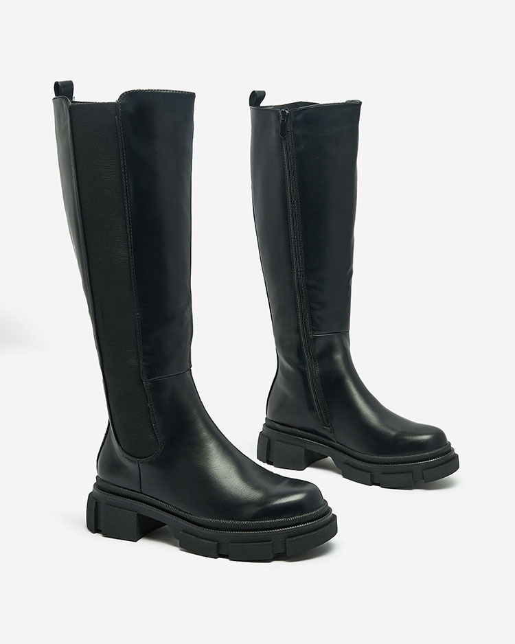 - Жіночі черевики до середини ікри, виготовлені з екошкіри з тканинною устілкою. Модель на плоскому каблуці. Декоративні вставки з тканини на носі та п'яті. Застібаються на блискавку з еластичною вставкою збоку.