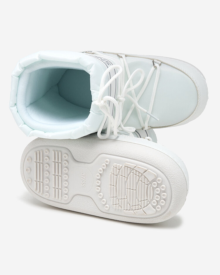 - Жіночі сніжні чоботи з манжетою з комбінації еко-шкіри та матеріалу з тканини з квільтованим малюнком. Підкладка з тканини всередині, шнурівка і взутий тип, має манжету.