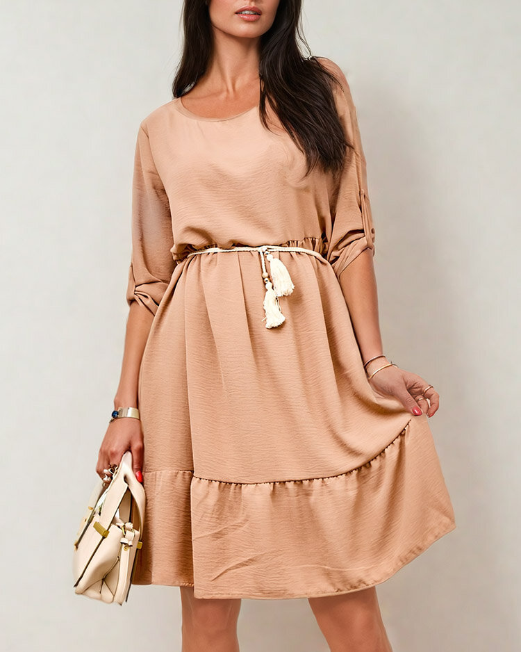 - Повсякденна жіноча сукня до коліна з довгими рукавами, що закочуються, і круглим вирізом. Плюс пояс у комплекті. Must have цього сезону! ПРИМІТКА: Похибка вимірювання (+/-) 1 см. Розміри виміряні в горизонтальному положенні.