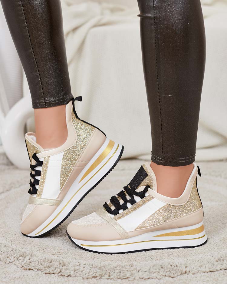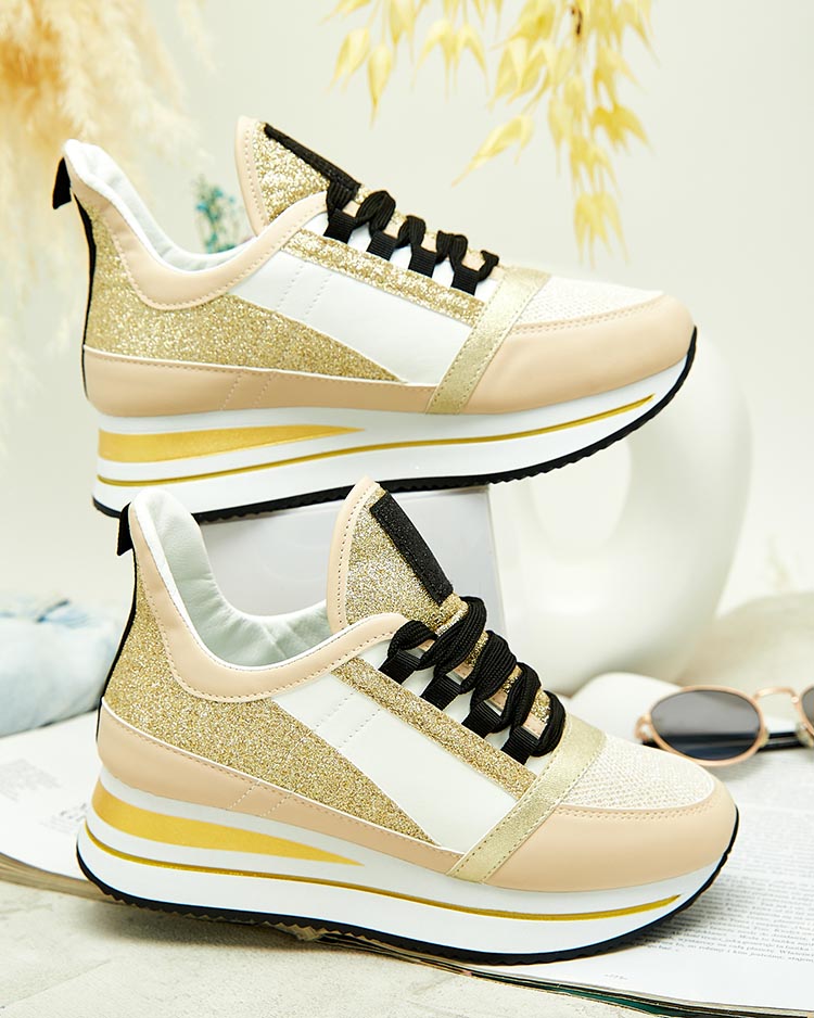 - Модні жіночі спортивні кросівки на підборах, виготовлені з комбінації еко-шкіри та тканини з глітером. Усередині устілка з екошкіри. Стануть чудовим аксесуаром для повсякденного стилю.