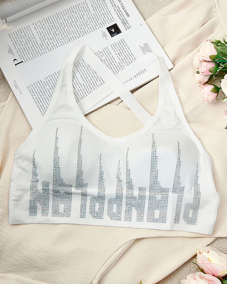 - Жіночий спортивний бюстгальтер з еластичного, приємного матеріалу. Модель з нерегульованими, перехрещеними бретелями, без застібки і зі знімними вставками, обробленими широкою гумкою внизу і прикрашеними цирконами. Ідеально облягає фігуру.