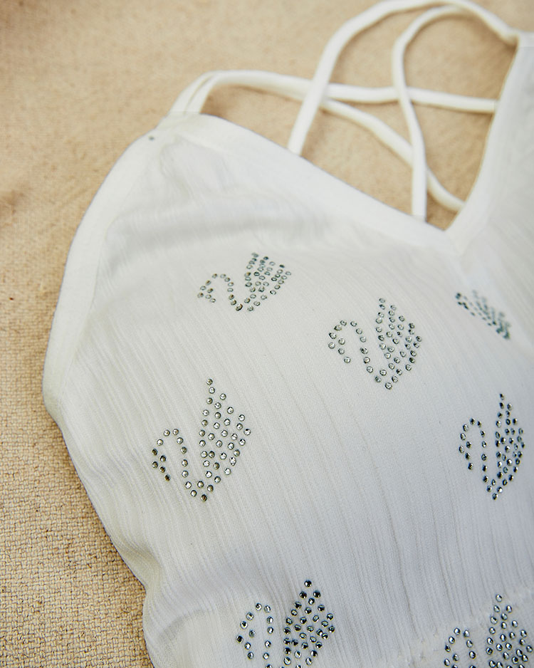 - Жіночий спортивний бюстгальтер з еластичного, приємного матеріалу. Модель з нерегульованими, перехрещеними бретелями, без застібки і зі знімними вставками, внизу оброблена широкою гумкою і прикрашена цирконами. Ідеально облягає фігуру.