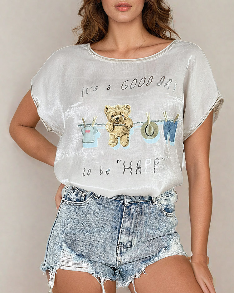 - Жіноча блузка з декоративним принтом. З коротким рукавом та круглим вирізом. Ідеально підходить для повсякденного носіння!