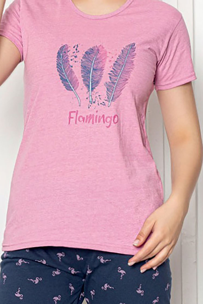 - Жіноча 2-компонентна піжама з бавовняної тканини, оздоблена декоративним принтом. Комплект складається з блузи з коротким рукавом та штанів 3/4 з еластичним поясом.