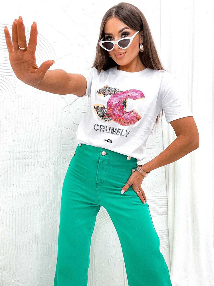 • Повсякденна жіноча футболка з принтом та цирконами на короткий рукав. Виготовлена з бавовняної тканини. Ідеальна основа для багатьох повсякденних образів! ПРИМІТКА: Похибка вимірювання (+/-) 1 см. Розміри виміряні в горизонтальному положенні.