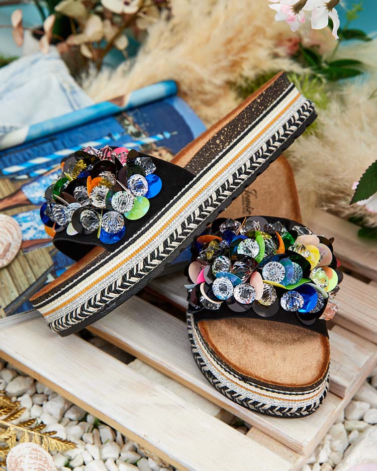 - Плоскі шльопанці зі стразами на ремінці - це унікальне поєднання стилю та комфорту. Верх та устілка з еко-замші надають їм елегантного вигляду. Підошва, декорована коркоподібним пластиком - додає їм оригінальності!