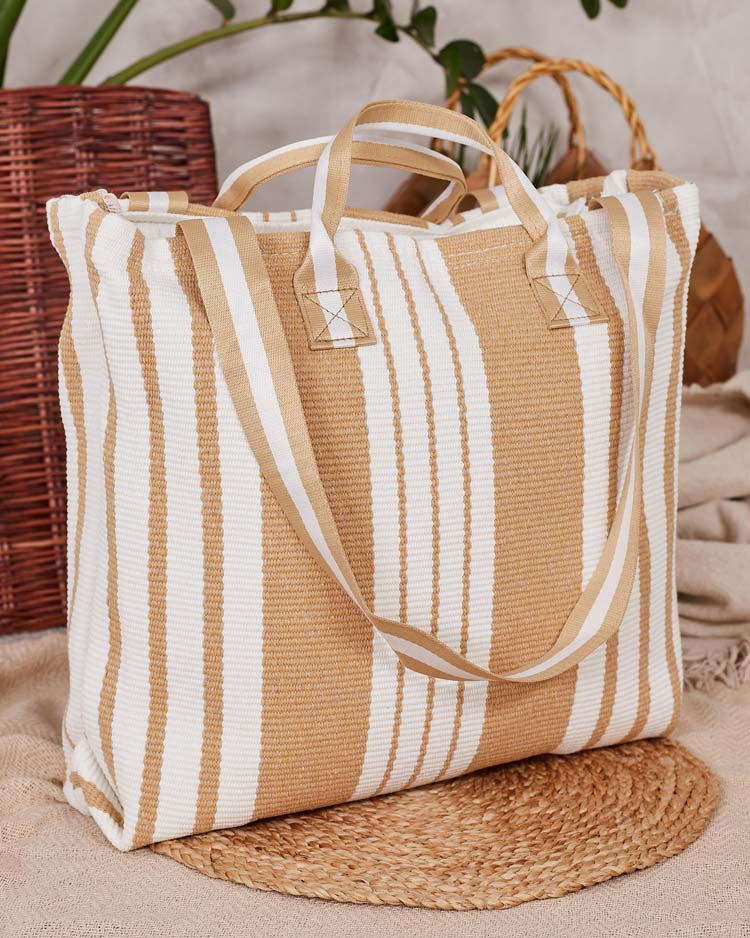 - Велика жіноча сумка, виконана з тканини в смужку. Модель має 1 відділення та застібається на блискавку. Ідеальна на кожен день або для пляжу!