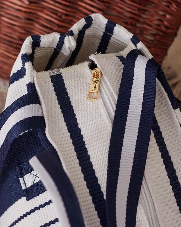 - Велика жіноча сумка, виконана з тканини в смужку. Модель має 1 відділення та застібається на блискавку. Ідеальна на кожен день або для пляжу!