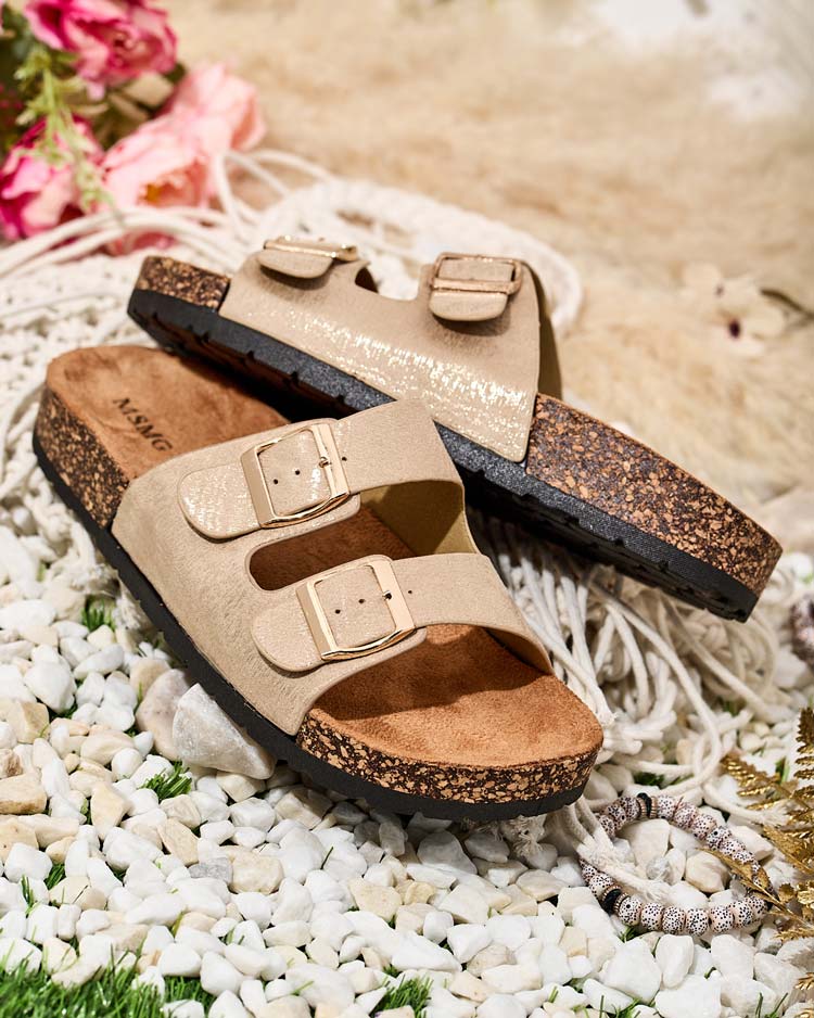 • Чудові жіночі шльопанці на плоскій підошві. Виготовлені повністю з екологічної шкіри. Мають декоративні пряжки на верхній частині. Підошва оздоблена матеріалом а-ля пробка. Ідеальний вибір для відпустки!