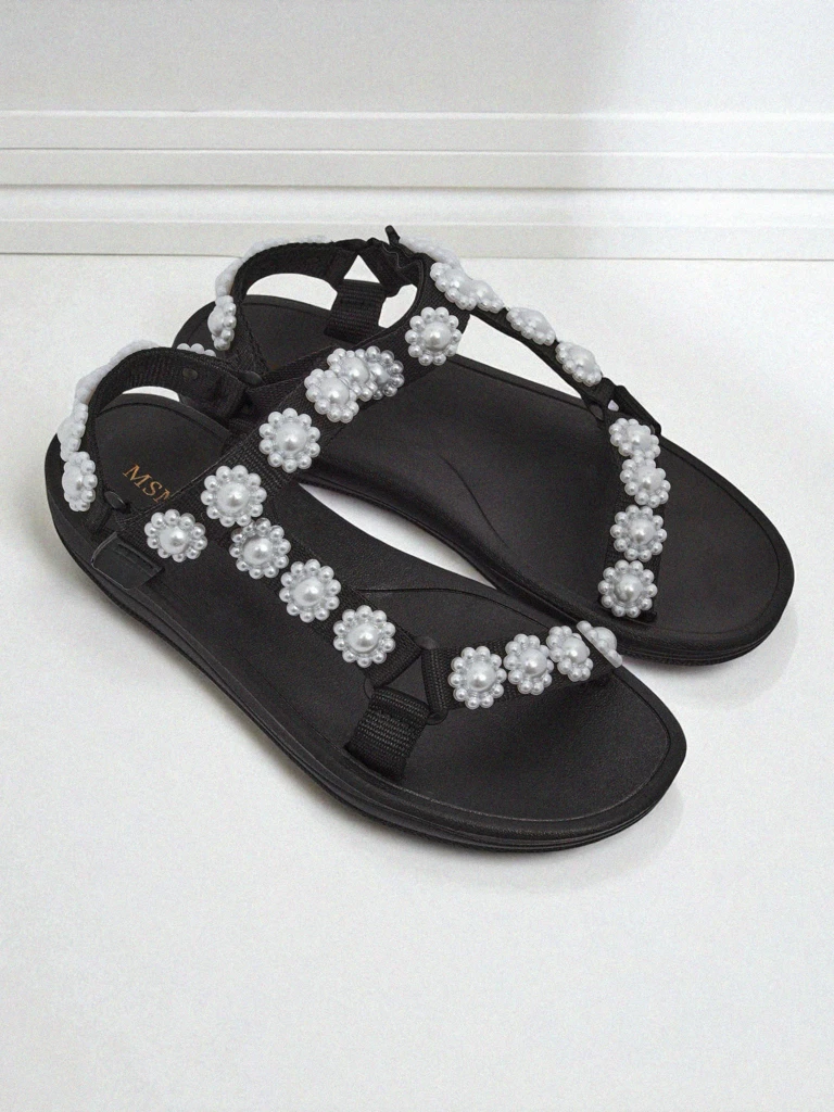 Відкрийте для себе останній тренд сезону – жіночі сандалі Royalfashion Perseida чорного кольору, прикрашені ефектними аплікаціями з перлинок. Ця модель виготовлена з високоякісної тканини та екологічної шкіри, завдяки чому сандалі надзвичайно легкі, повітропроникні та комфортні навіть у спекотні літні дні. Устілка та підкладка з екологічної шкіри гарантують задоволення від використання та легкість чищення, а плоска платформа висотою 2 см забезпечує зручність і стабільність кроку. Взуття застібається на липучки, що забезпечує швидке припасування до стопи та зручне взування, а відсутність носка робить сандалі ідеальними для демонстрації педикюру. Модель Perseida вирізняється не тільки класичною, позачасовою лінією, але й сучасним доповненням у вигляді тривимірних квітів з перлинок, які відповідають актуальному тренду «pearlcore».