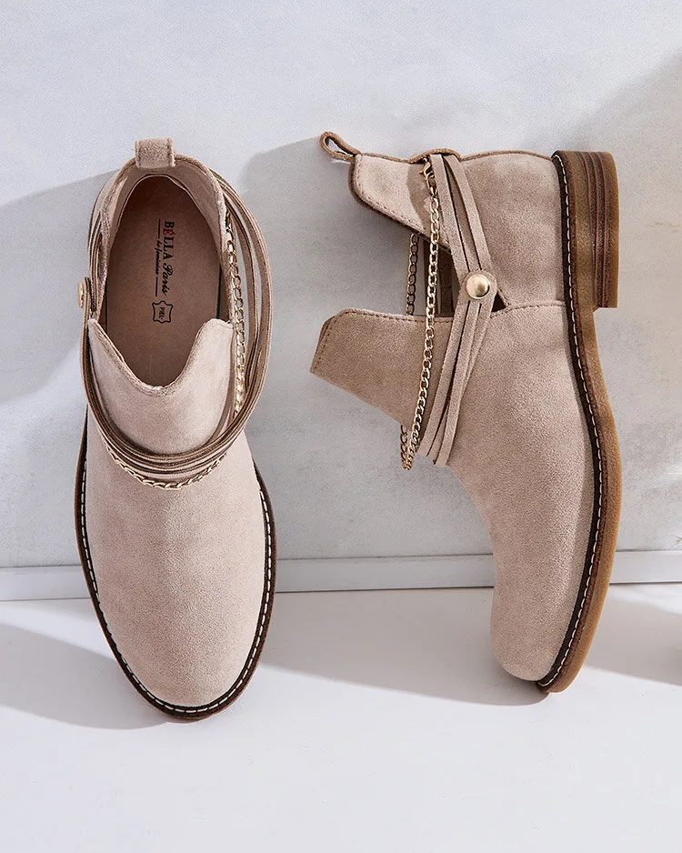 • Стильні жіночі черевики з екозамші з устілкою з натуральної шкіри ідеально підійдуть для холодних днів. Модель сліпони з декоративними ланцюжками на верхній частині. Взуття на плоскому каблуці та з круглим носком. Чудове доповнення до повсякденних образів