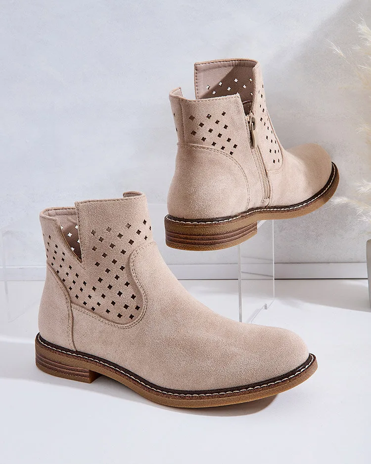 • Стильні жіночі черевики з еко-замші з устілкою з натуральної шкіри ідеально підходять для холодних днів. Верх застібається на блискавку. Модель на плоскому каблуці та з круглим носом. Супер доповнення до повсякденних образів!