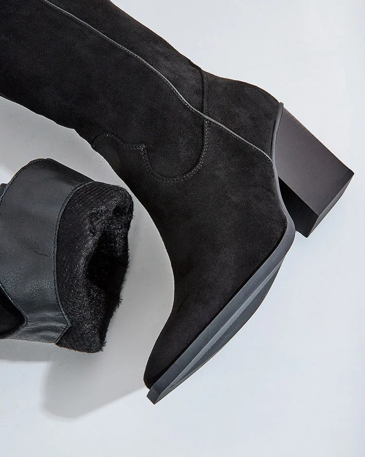 - Чоботи а-ля ковбойські на невисоких підборах, з натуральної замшевої шкіри з декоративним тисненням. Устілка тканинна, застібаються на блискавку до середини халяви. Взуття має ніжне хутро. Підійдуть до багатьох жіночих образів!