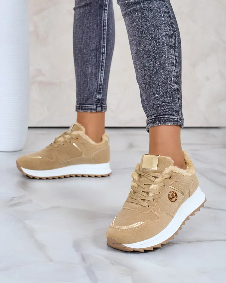 • Спортивні жіночі кросівки на потовщеній підошві. Верх на шнурівці, з екологічно чистого нубуку. Внутрішня частина повністю утеплена хутром. Ідеальні для холодних днів!