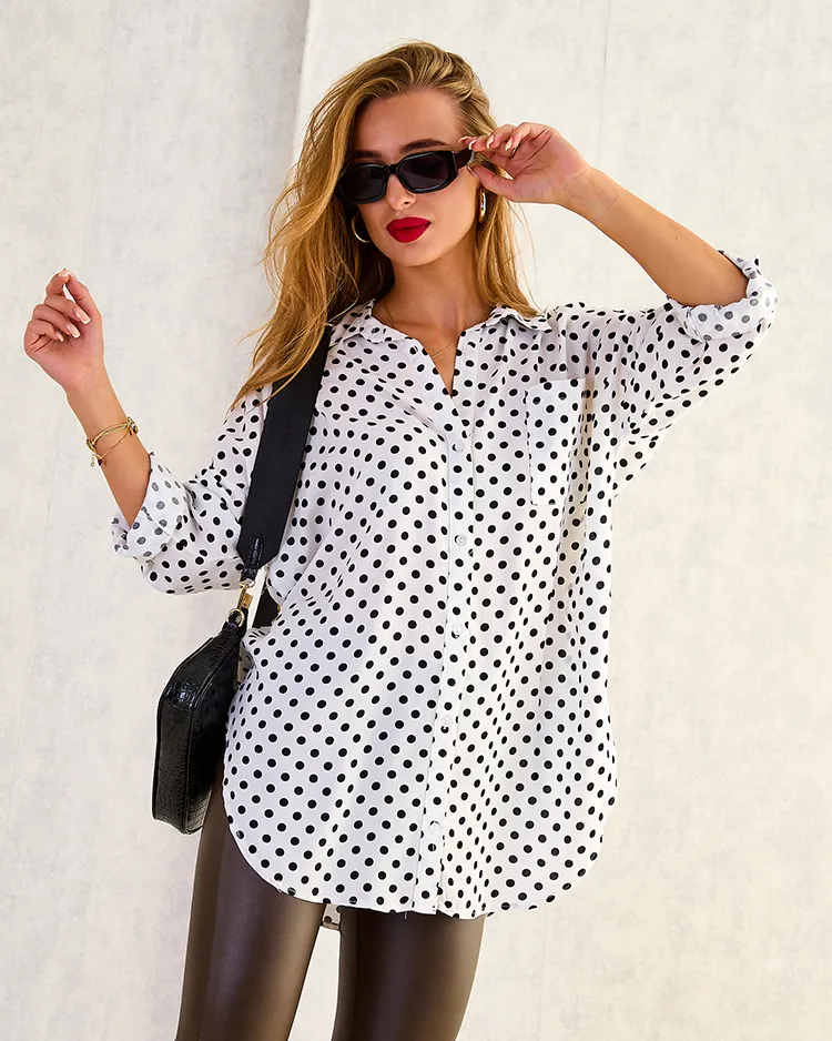 - Сенсаційна жіноча сорочка в горошок з закатаними рукавами. Модель з комірцем, застібається на ґудзики. Must have в гардеробі кожної жінки!
