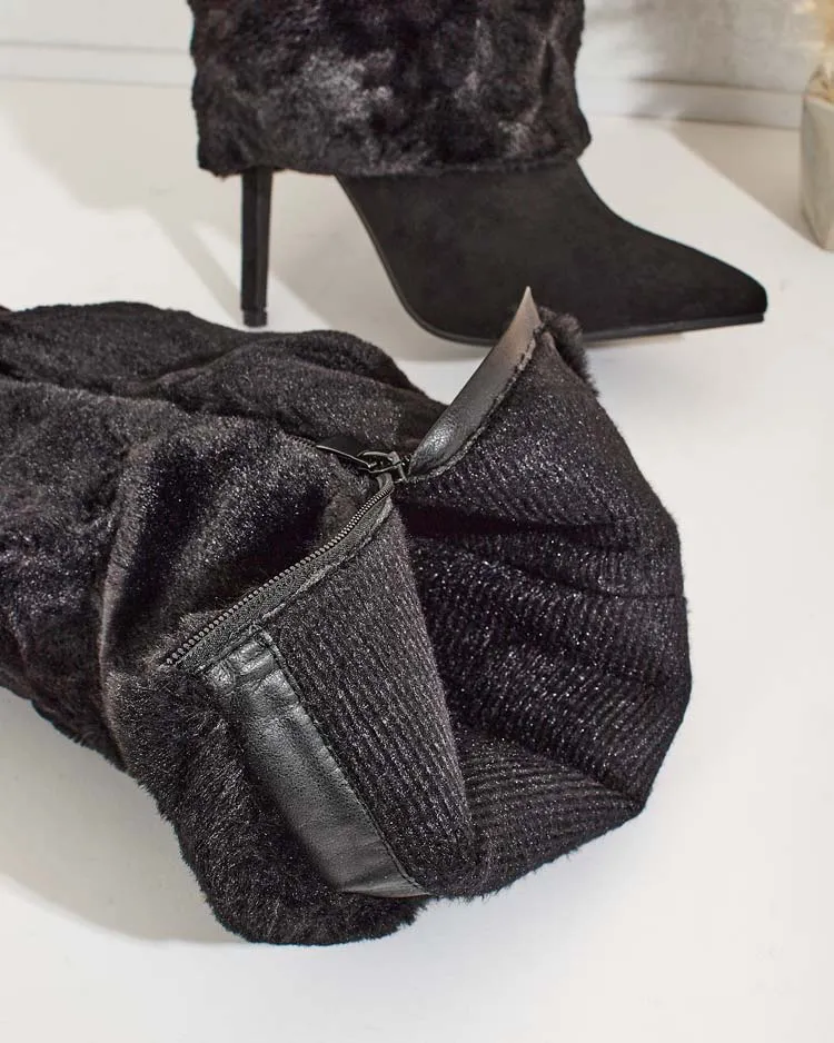 - Жіночі черевики на шпильці з загостреним носком. Виготовлені з екологічної замші, ззовні вкриті додатковим шаром а-ля хутро, всередині делікатний утеплювач. Модель застібається на блискавку. Ідеальний вибір для зимових образів!