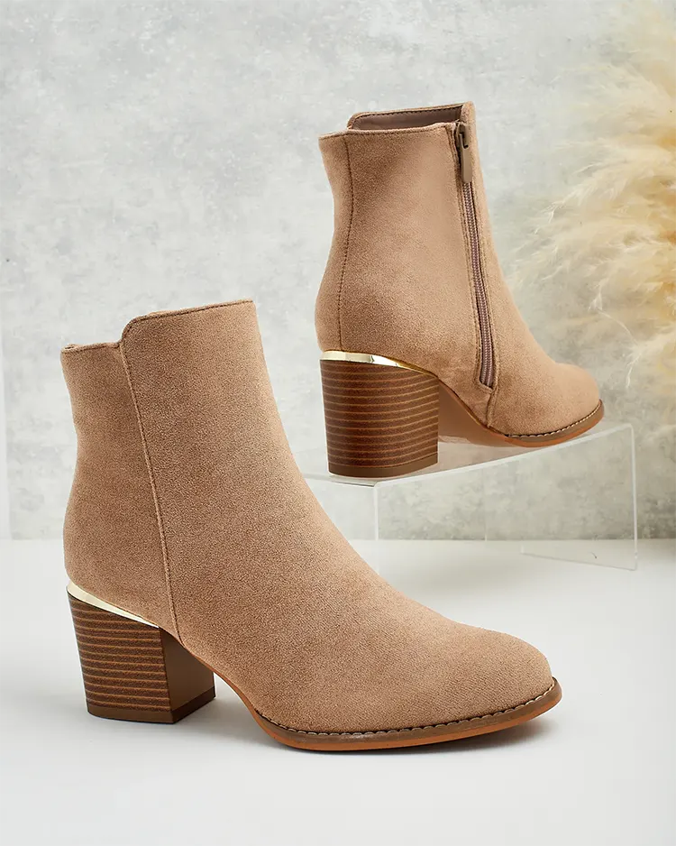 • Стильні жіночі черевики на низькій шпильці. Верх виконаний з натуральної замшевої шкіри. Середина наповнена м'яким хутром. Застібка на блискавку, круглий ніс. Чудовий вибір на осінь!