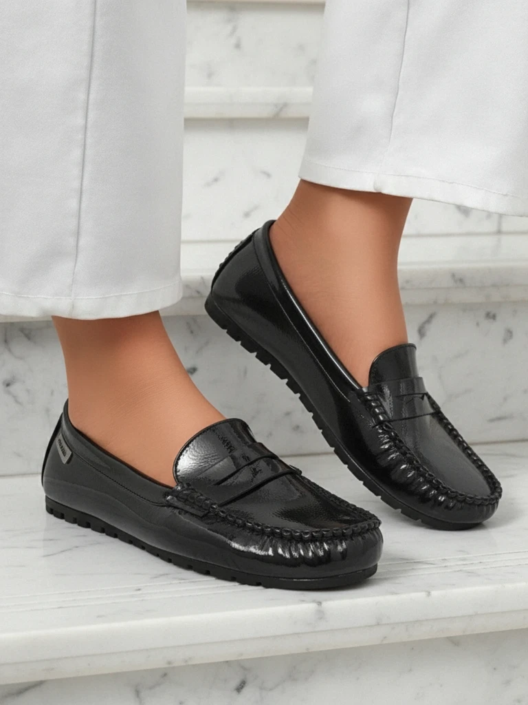 Мокасини Cyra Nero – це стильна пропозиція для жінок, які цінують комфорт і позачасовий дизайн, натхненний італійським стилем. Верх виготовлений з високоякісної екологічної матової та лакованої шкіри, що надає взуттю витончений блиск і елегантність. Устілка – це поєднання екологічної та натуральної шкіри, що забезпечує м'якість і комфорт протягом усього дня. Плоский каблук і гнучка підошва дозволяють зручно використовувати навіть під час тривалої ходьби. Процес виробництва базується на ретельно підібраних матеріалах, які гарантують міцність і стійкість до стирання, і водночас є екологічно чистими. Сучасні технології шиття забезпечують бездоганне оздоблення та виняткову естетику взуття. Загальна вага становить лише 606,67 г, завдяки чому мокасини легкі та не обтяжують ноги. Найважливіші переваги мокасинів Cyra Nero – це універсальний чорний колір, ідеальний як для повсякденного носіння, для офісу, так і для більш офіційних випадків. М'яка, профільована устілка адаптується до форми стопи, мінімізуючи ризик натирання та забезпечуючи свіжість навіть після цілого дня. Взуття чудово підходить для весни, літа та осені – його повітропроникність запобігає перегріванню ніг. 1. Casual: Носіть мокасини Cyra Nero зі світлими джинсами та білою сорочкою оверсайз – ви отримаєте невимушений, але витончений образ для роботи або зустрічі з друзями. 2. Офіс: Підберіть сигаретки в приглушеному кольорі та піджак – класична елегантність з ноткою сучасного шику підійде для важливих зустрічей. 3. Вечір: Поєднуйте з чорною, облягаючою сукнею та мінімалістичною сумочкою на ланцюжку – ви створите жіночний і вечірній образ. Догляд за мокасинами надзвичайно простий – достатньо регулярно протирати вологою ганчіркою, уникати намокання та використовувати спеціальні препарати для екошкіри. Внутрішню частину взуття варто освіжати антибактеріальними засобами або натуральними поглиначами запаху. Зберігайте мокасини в провітрюваному місці, найкраще в коробці або бавовняному мішечку. В сучасних трендах наймодніші класичні чорні мокасини з лакованої шкіри – вони підходять як для повсякденних, так і для елегантних стилізацій, поєднуючи зручність і універсальність. Мокасини Cyra Nero – це must-have на новий сезон і чудова база для багатьох позачасових комплектів.