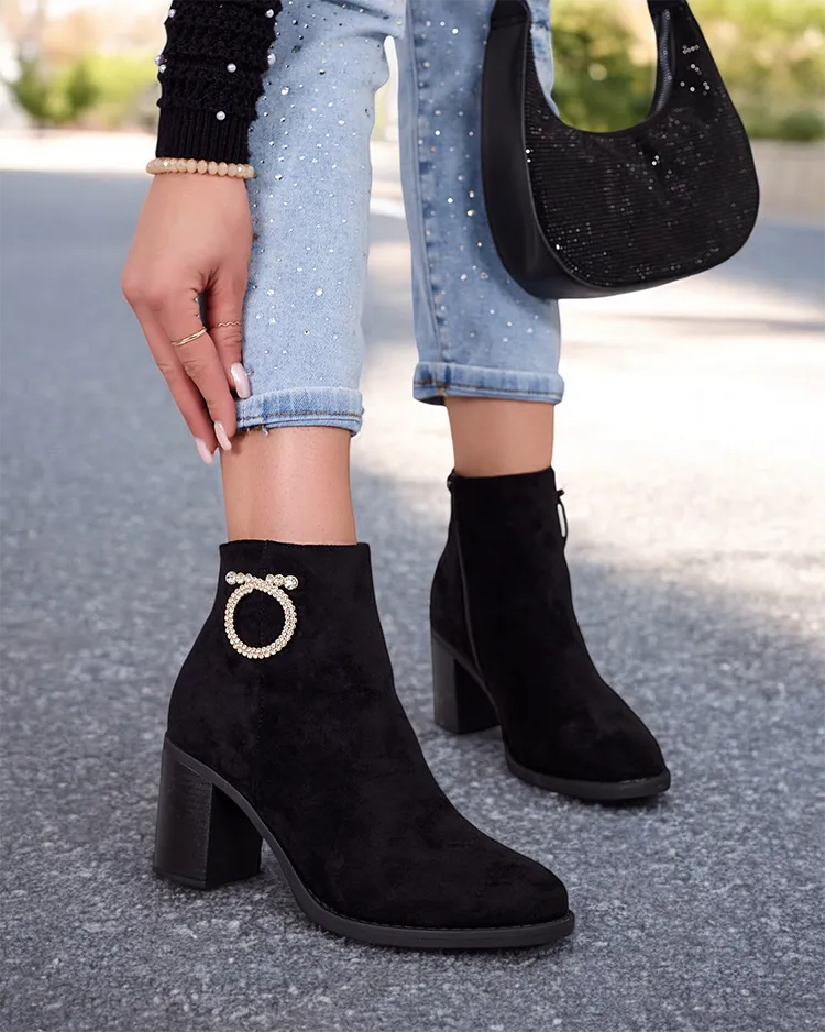 - Черевики на шпильці - стиль і комфорт в одному. Модель застібається на блискавку. Повністю виготовлені із замшевої екошкіри, по центру наповнені хутром. Взуття має елегантний декор на верхній частині. Ця модель додасть вам впевненості!
