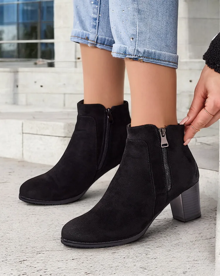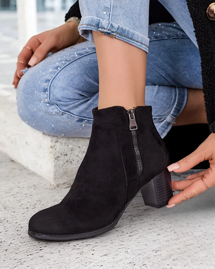 • Елегантні чоботи на маленькому каблуці - це ідеальне поєднання елегантності і комфорту. Модель виготовлена з екологічної замші та має ніжну підкладку, що надає стильний вигляд для будь-якої події. Взуття має декоративний блискавку та абразії н?
