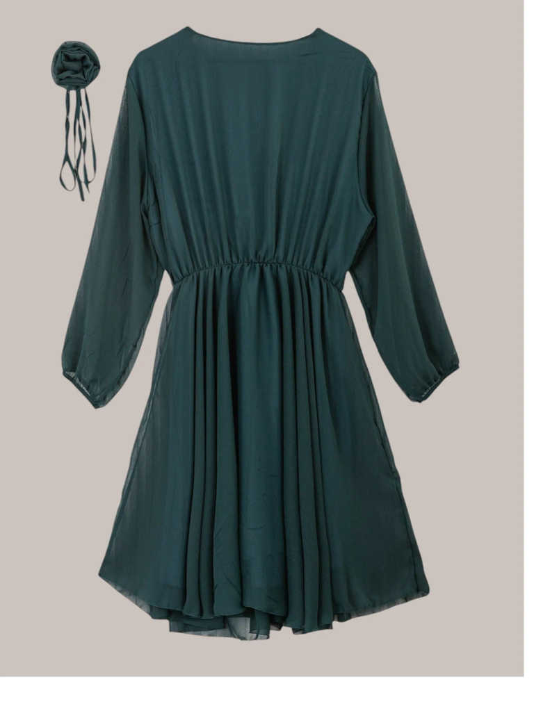 • Елегантне, безчасове жіноче плаття до коліна з обмітковим вирізом і еластичним поясом. Плаття має довгі рукави із сітки та декоративний додатковий пояс з квіткою. Відмінний вибір для вечора на вечір!