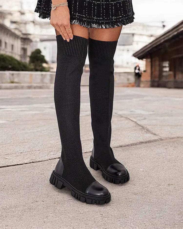- Стильні жіночі чоботи вище коліна на товший підошві. Верх виготовлений з гнучкого тканинного матеріалу з вставками з еко-шкіри, в середині є тканинна устілка. Модель без застібок. Ідеально підходить для повсякденних осінніх образів!