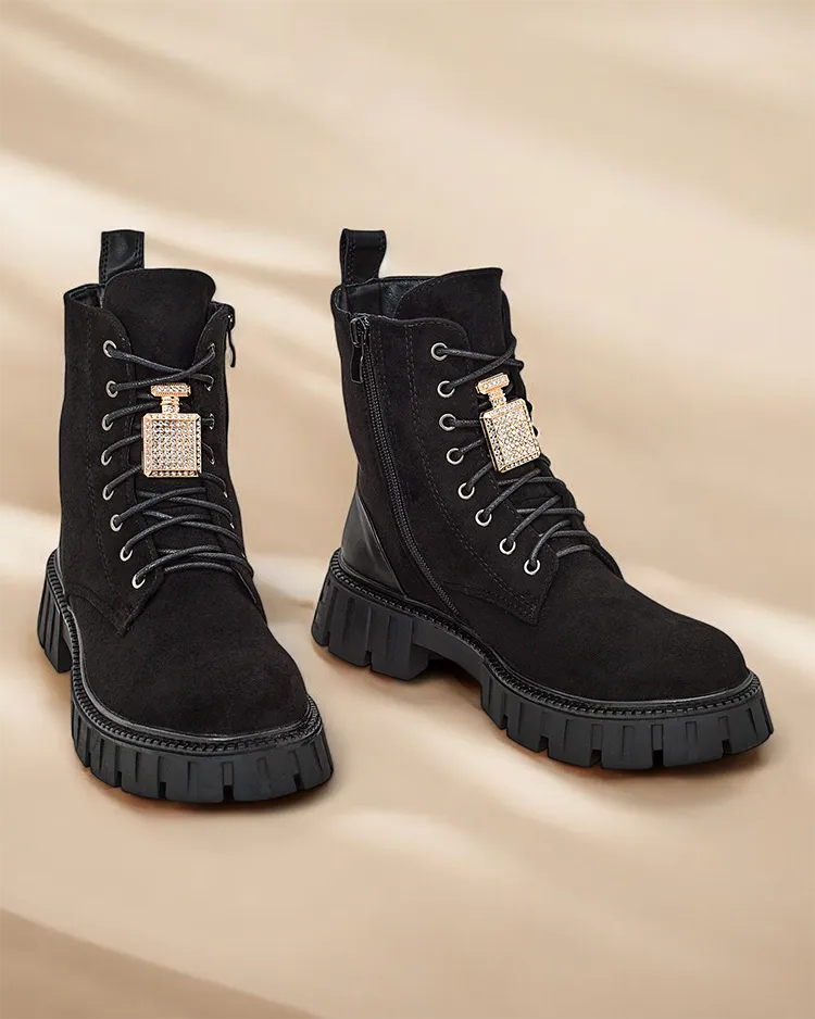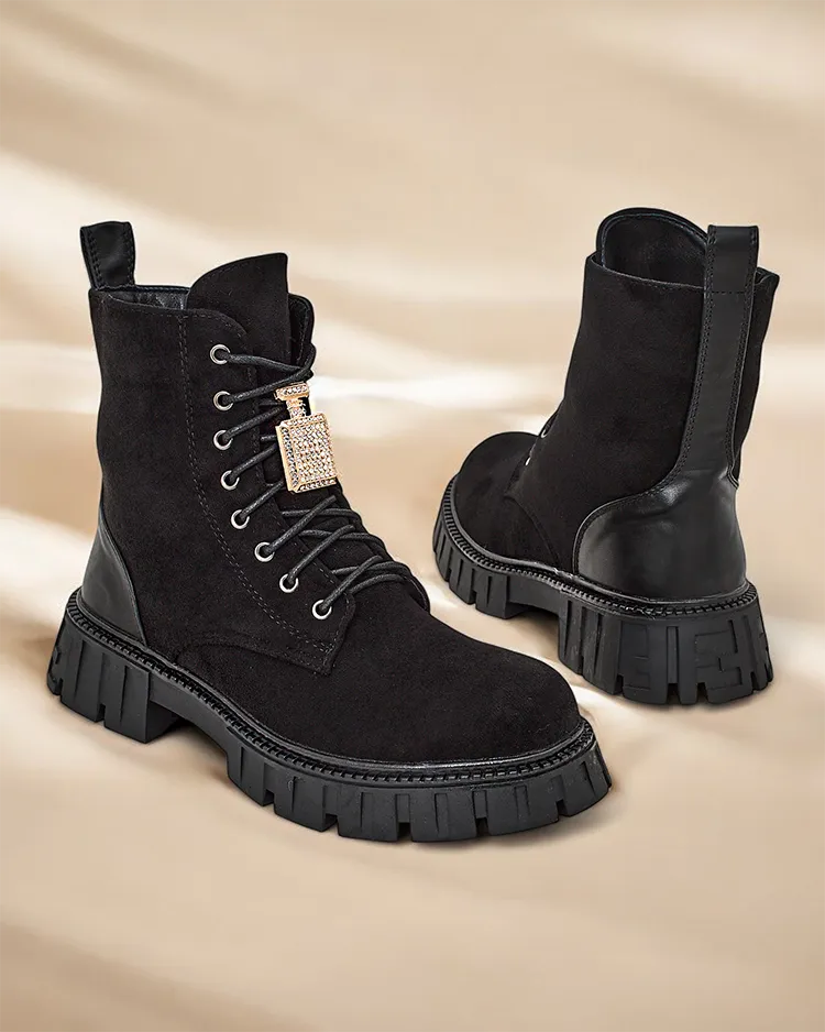 • Ботинки для женщин в стиле ботинок - это исключительная обувь, сочетающая в себе стиль и комфорт. Изготовлены из экозамши и наполнены мягким мехом. Модель с шнуровкой и молнией. Более толстая подошва добавляет комфорта к обуви.