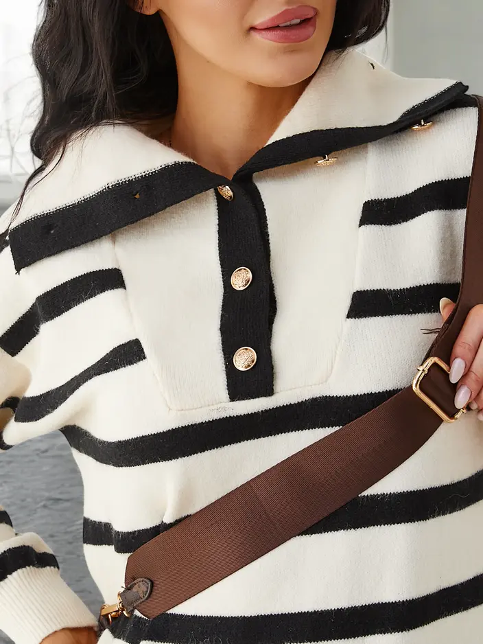 - Жіночий середній светр сукня з довгими рукавами. Модель з в'язання. Горловина застібається на гудзики. Необхідний атрибут цього сезону! УВАГА: Точність вимірювання (+/-) 1 см. Розміри виміряно пласко.