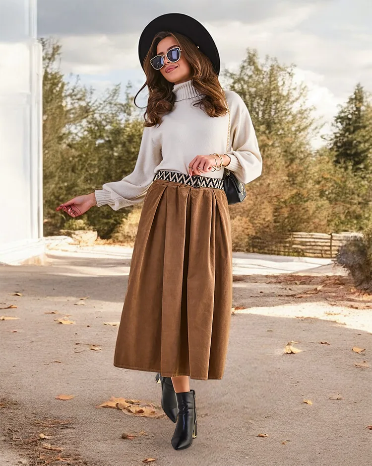• Спідниця-міді для жінок з м'якої тканини, схожої на кордурой. Модель оснащена поясом. Ідеальна база для багатьох унікальних образів! ПРИМІТКА: Точність вимірювань (+/-) 1 см.