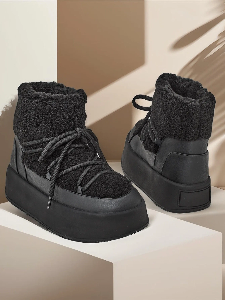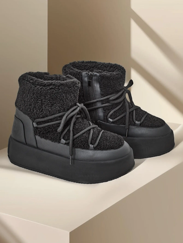 - Жіночі сніжні черевики зі стовбуром, виготовленим з поєднання еко-шкіри та приємної тканини. Усередині знаходиться приємна хутряна підкладка, взуття має блискавку та шнурований стовбур. Ідеально підходять для зими!