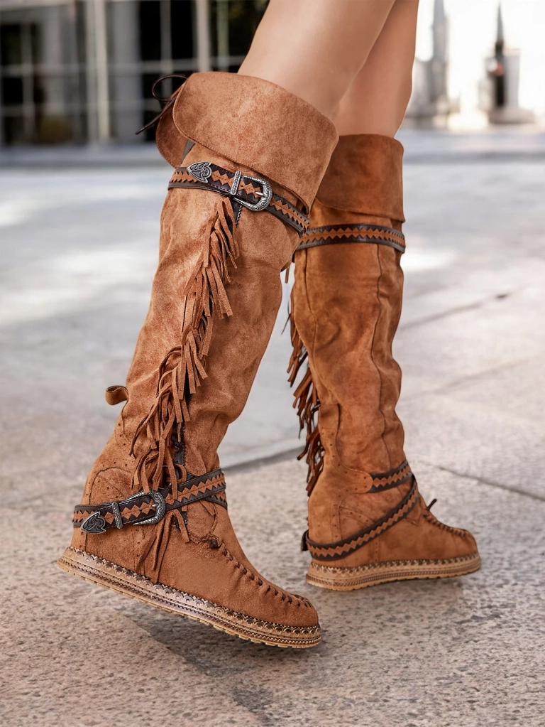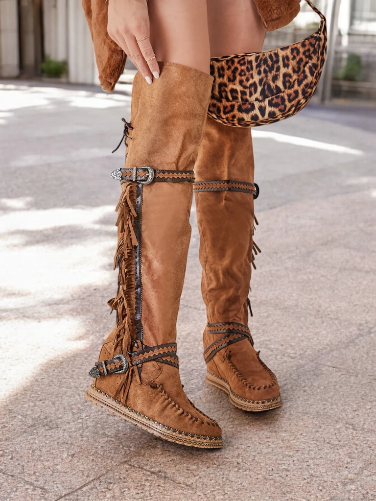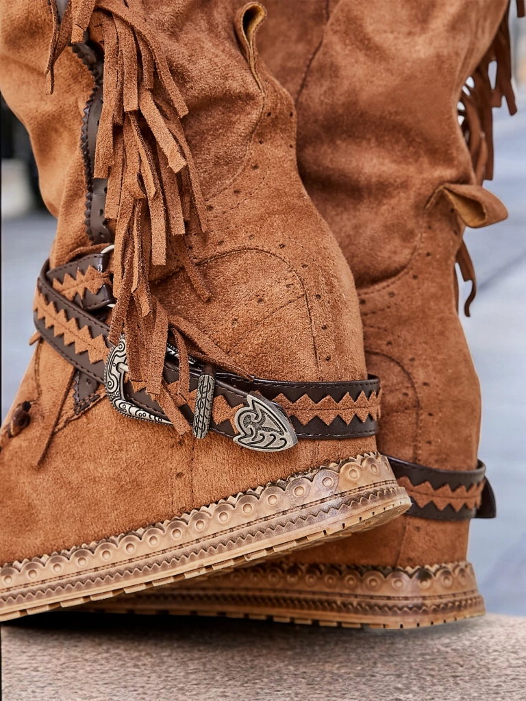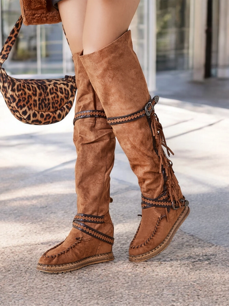 • Стильні жіночі черевики за коліно з прихованим каблуком. Верх виготовлений з еко мікросвітла шкіри. Тканинна підкладка. Модель на шнурівці, прикрашена кисточками та тисненими ремінцями.