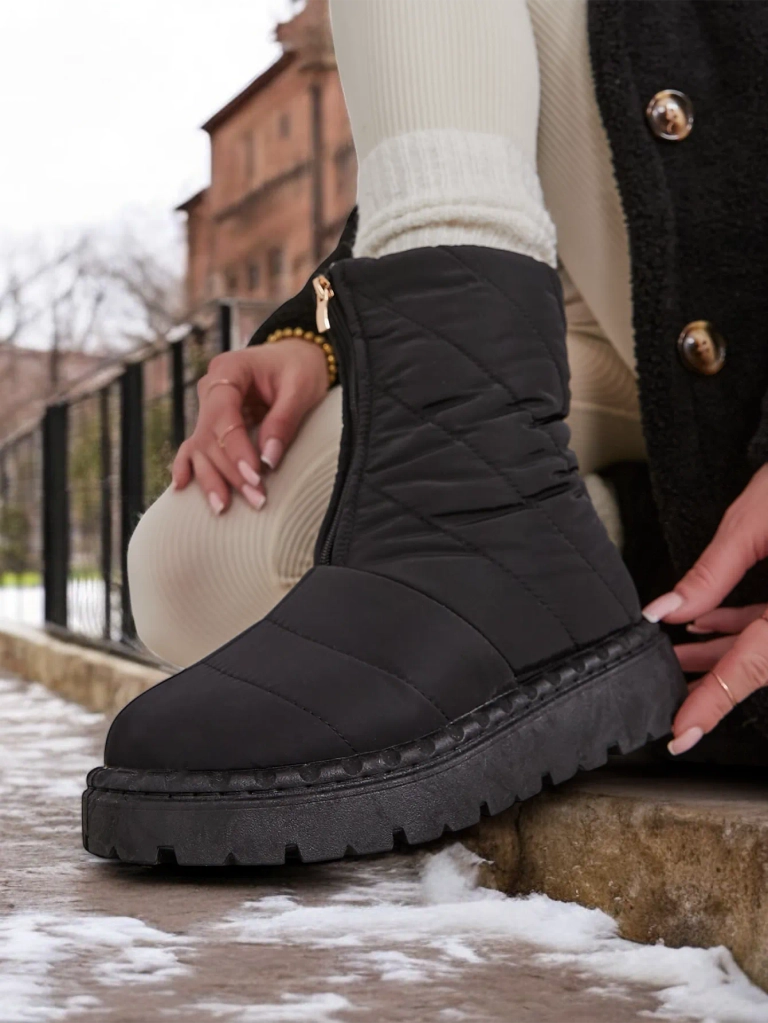 - Жіночі сніжні чоботи з верхом, виготовленим з матеріалу, подібного до воскованої тканини. Всередині підкладка зі штучного хутра, на чоботах є застібка-блискавка посередині. Ідеальні для холодних сезонів!