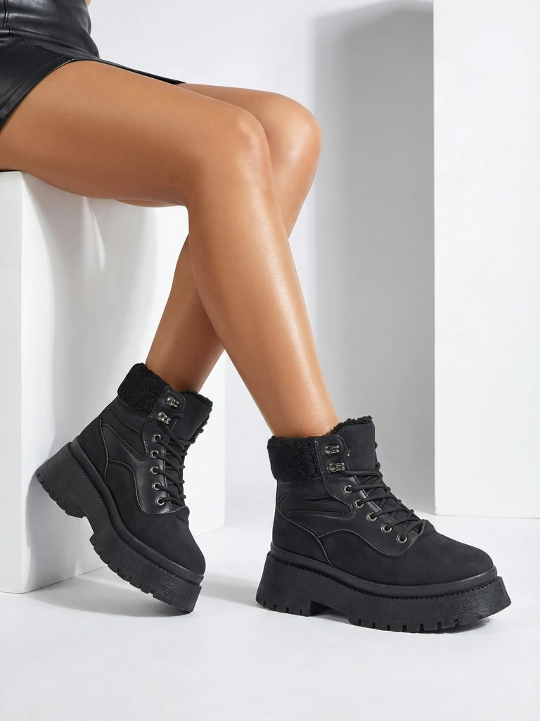 • Класичні жіночі сніжні чоботи з товстими підошвами. Верх виготовлений з штучної шкіри. Всередині відстібний підклад у вигляді штучного хутра, чоботи на шнурках. Ідеально підходить для прохолодного сезону!