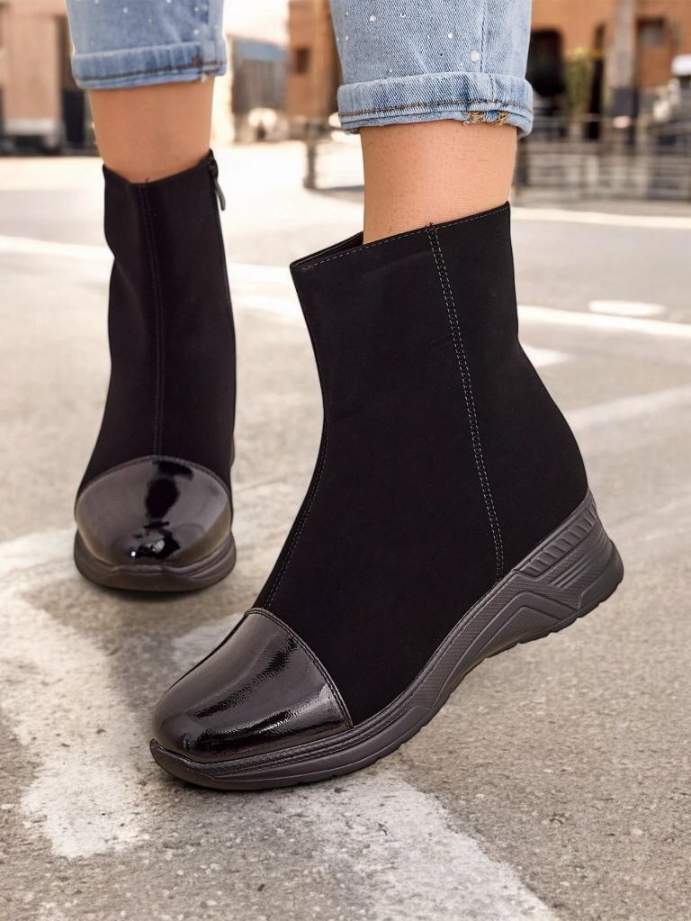 - Чудові жіночі ботфорти на каблуці, виготовлені з матової еко-шкіри з лаковим носком. Всередині вони обшиті приємним хутром. Модель застібається на блискавку. Ідеально підійдуть для осінніх образів!